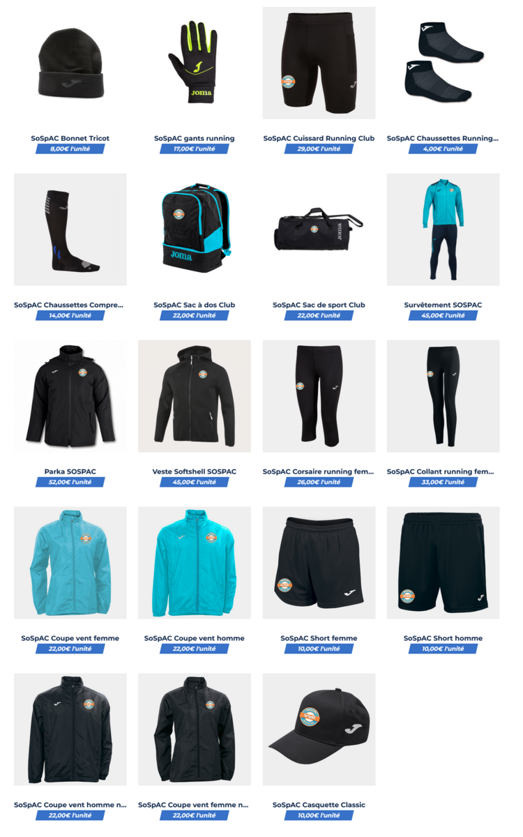 Maillots, survetements, blousons, sacs, shorts etc... Du 08 ans au XXL, vous trouverez toute la gamme Joma officielle du club pour vos compétitions et entrainements sur notre espace Origine'Sport : https://www.originesport.com/club/sospac-sport-pour-tous/ Mot de passe accès adhérents : sospac202309