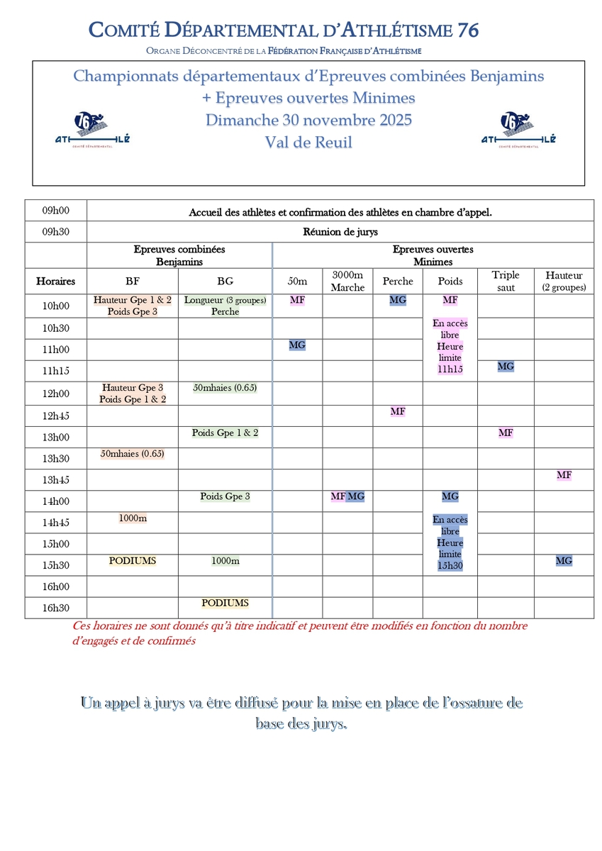 Il s'agit pour les benjamins des championnats d'épreuves combinées avec l'obligation de participer aux 4 épreuves :