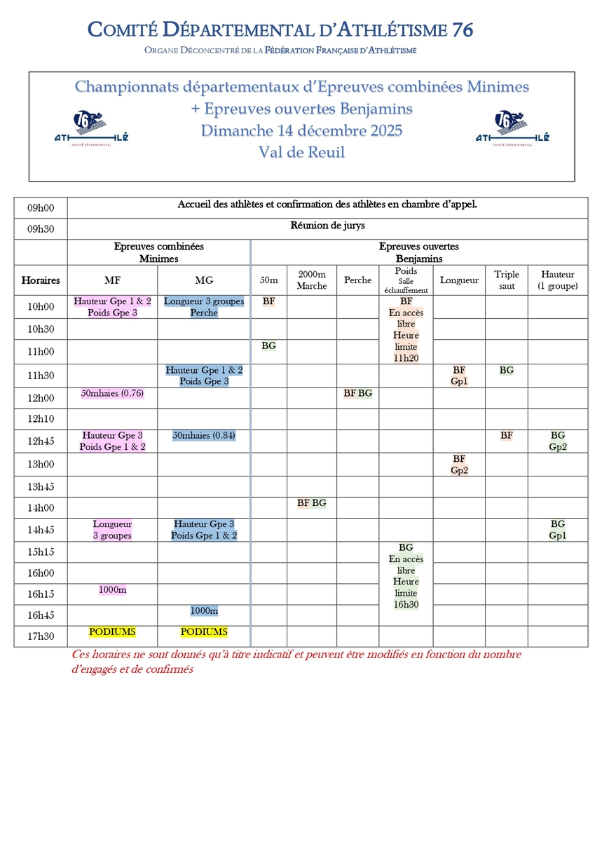 Il s'agit pour les minimes des championnats d'épreuves combinées avec l'obligation de participer aux 5 épreuves :