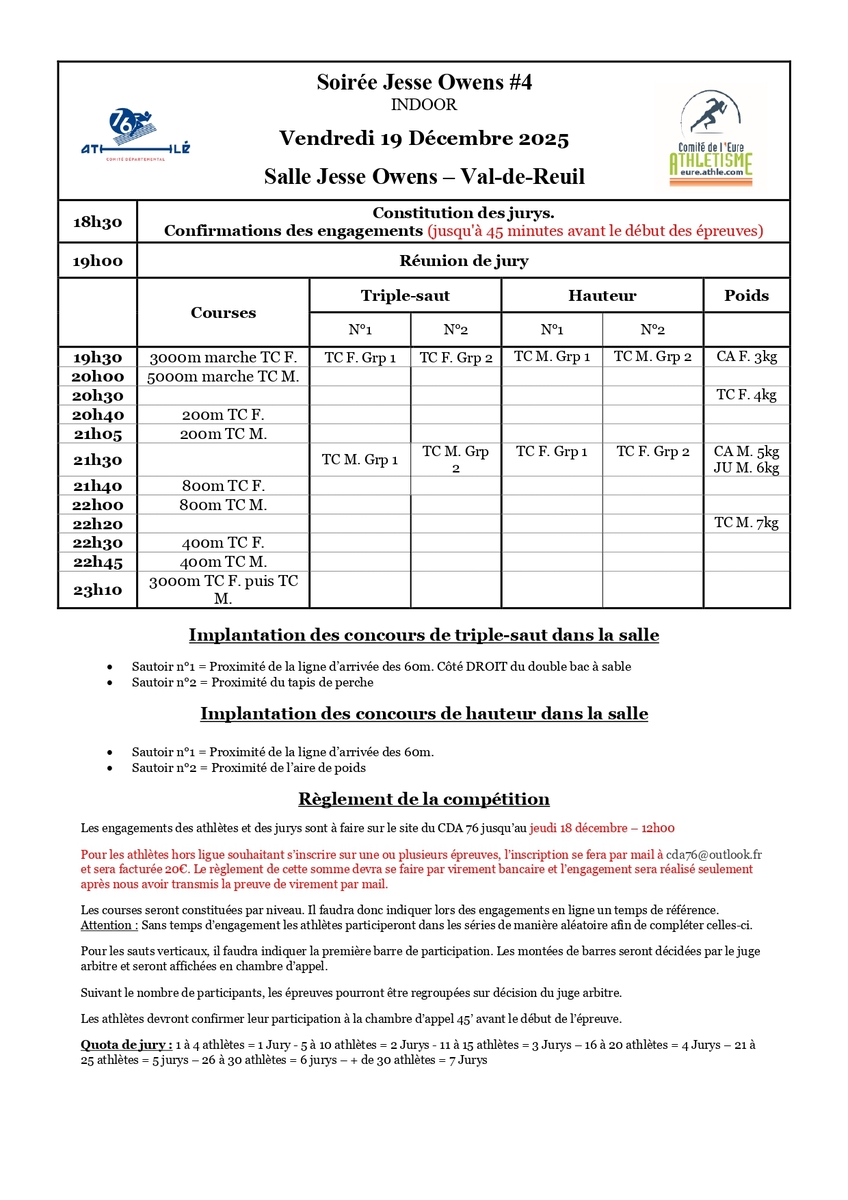 4eme soirée Jesse Owens de la saison, consacrée aux sprints longs, à la marche, au demi-fond avec également du triple, de la hauteur et du poids